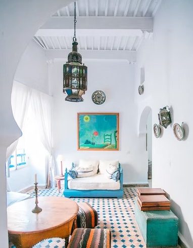 What you will definitely find in Moroccan architecture is the distinctive lamps. Moroccan lamps have covers made of iron, glass, or beads that make the light feel softer and dimmer. This minimal lighting can make the room seem more mysterious and warm.